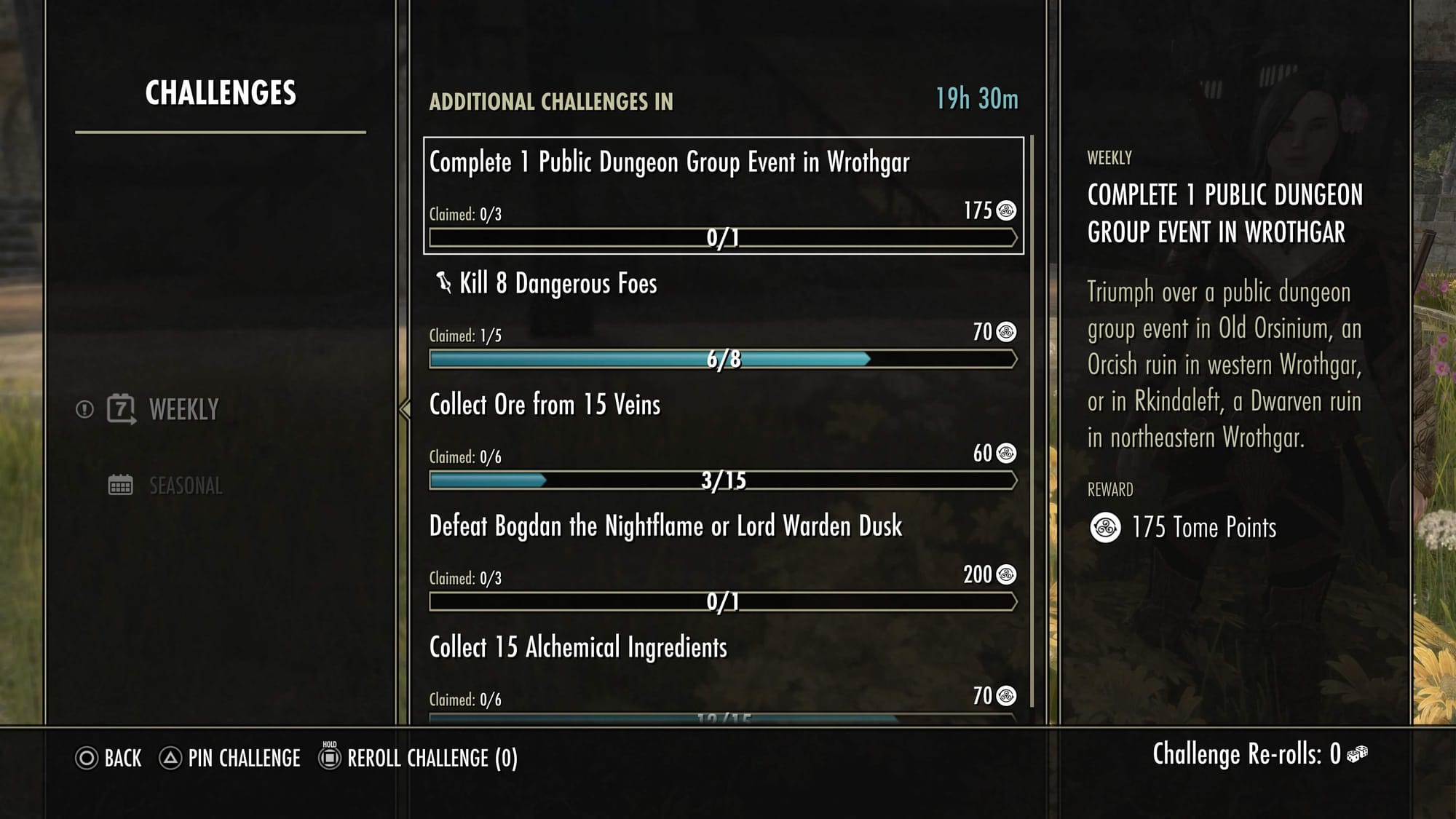 For example, gathering challenges often reward 60 Tome Points and can be completed six times, giving a total of 360 points. Meanwhile, I received a challenge to “Complete 1 public dungeon group event in Wrothgar,” which can be completed three times and rewards 175 Tome Points each time, for a total of 525 points.