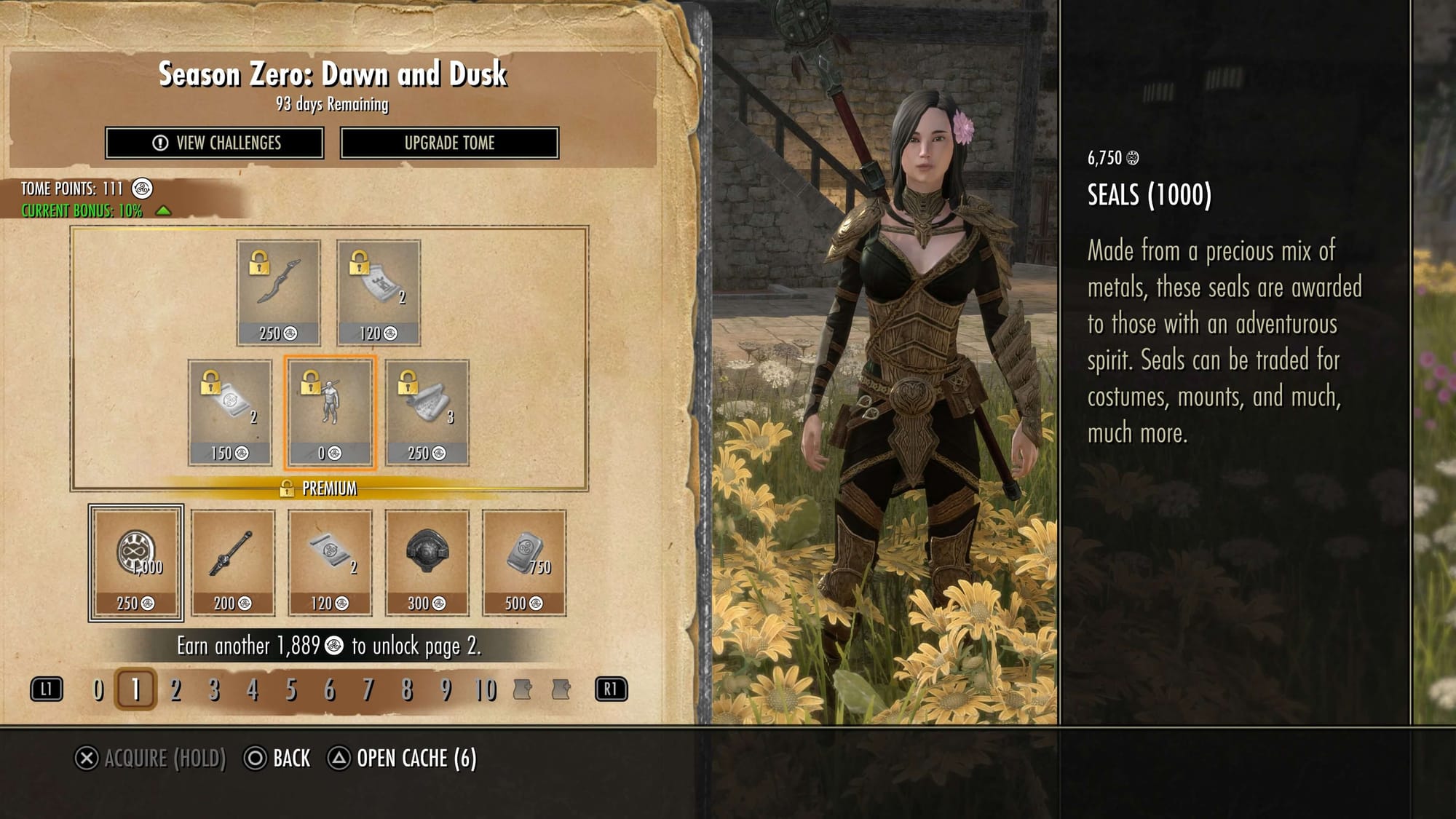 The Tamriel Tomes system works similarly to battle pass progression systems found in many other games. The pass includes 10 main pages and two bonus pages filled with both free and premium rewards that can be unlocked using Tome Points. As you earn points, you’ll progress through the pages of the pass, with each page requiring a certain number of points to unlock, and each reward also costing a set amount before it can be claimed.